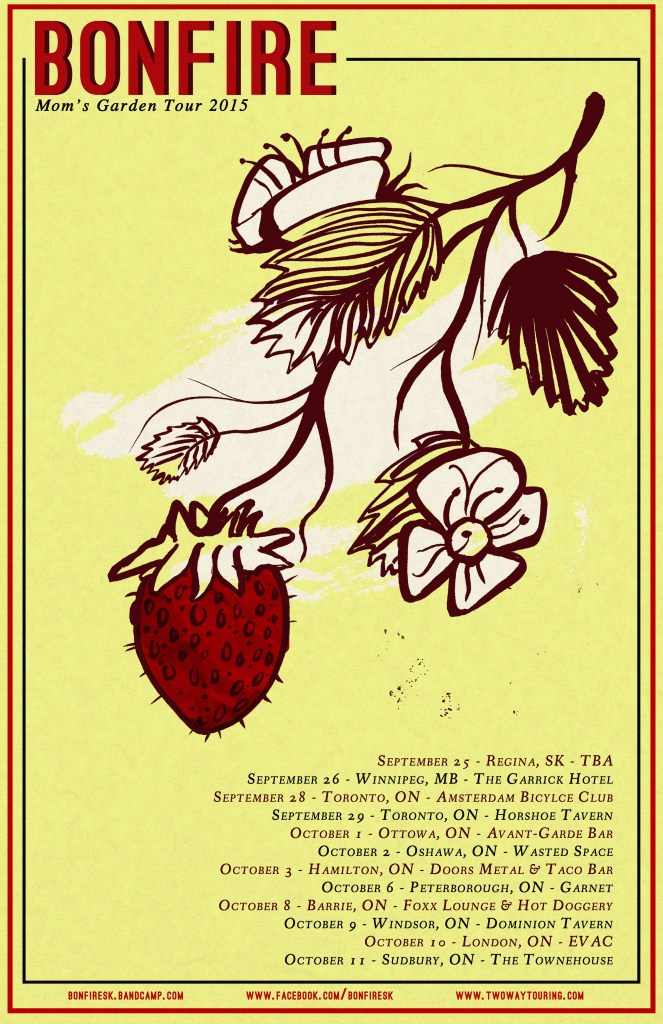 “Well guys, today we’re announcing our new EP “Mom’s Garden”. We’re releasing it October 2nd, and are excited for you guys to hear it. We are streaming the song “Snow Crest” on our soundcloud so please give that a listen! We will also be going on an eastern Canada tour at the end of September to promote the release, so come see us if you can! Dates are listed below:” – Kurt Wolfe (Drums), Bonfire (Sask)