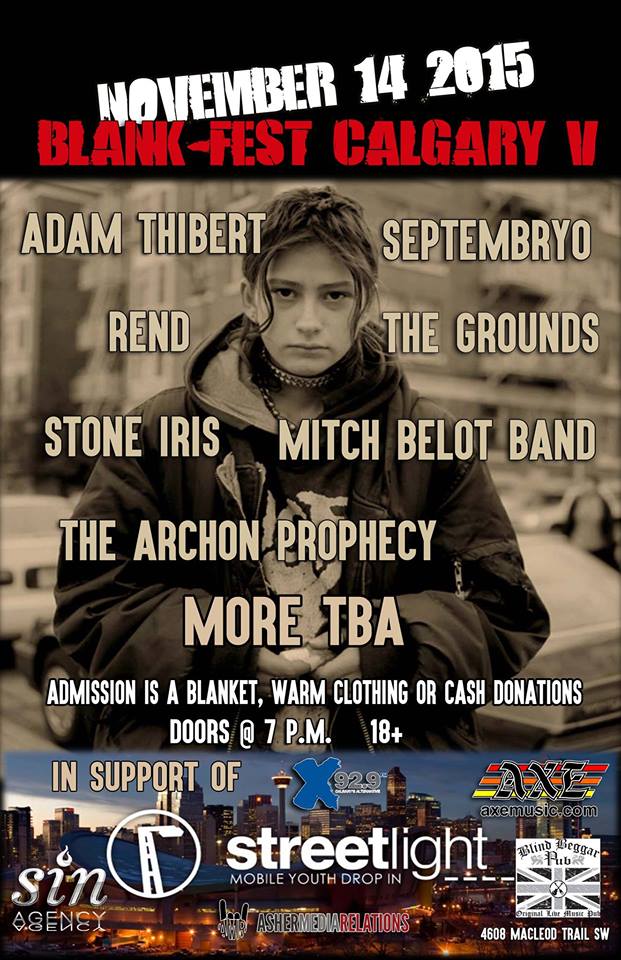Raising nearly $5,000 dollars and over 700 blankets since 2011, this year’s Blankfest Calgary is proud to return on November 14th at The Bling Beggar Pub to aid the Streetlight Mobile Drop-In by Youth Unlimited with support from X92.9 FM, Axes Music, Asher Media Relations and this year’s line up of local artists Adam Thibert, Septembryo, The Grounds, Mitch Belot Band, The Archon Prophecy plus support from Edmonton’s REND and Stone Iris along with more to be added. (full details below).