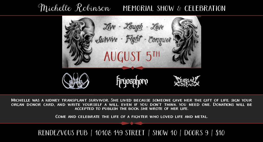 Michelle Robinson was a fan of the Edmonton metal scene, supporting many local bands over the years and bringing a smile to all those she touched. Suffering from kidney failure, living on and off dialysis to finally receiving a kidney transplant that allowed her to live for nearly 20 years because someone gave her the gift of life, she helped motivate a community to stay strong. Unfortunately her battle came to end this year on June 2nd and now her friends, family and fans want to encourage the public on the importance of organ donation.