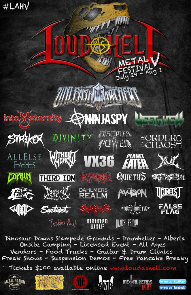 Semchuk Productions, Jurassic Ink Custom Tattoo, Metal Nation Radio, Prairie Fire Events, and Asher Media Relations are proud to announce the return of this year’s 2016 Loud As Hell Heavy Metal Festival V in Drumheller, Alberta at the Dinosaur Downs Stampede Grounds.