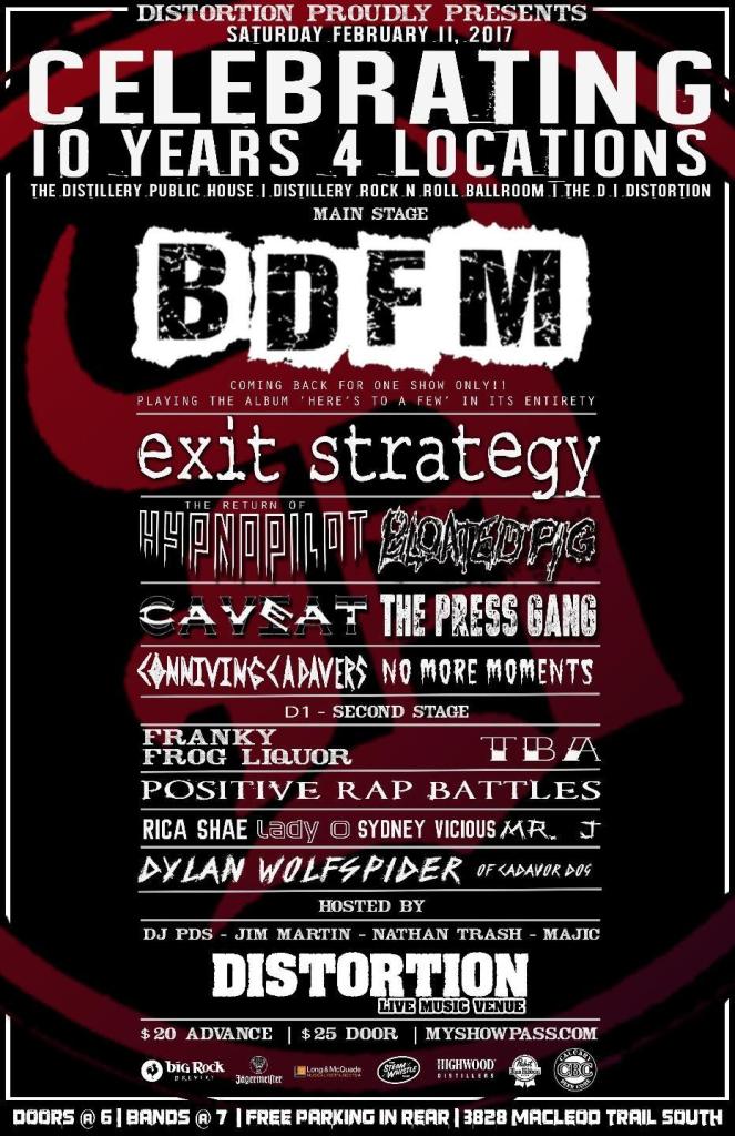 Saturday, February 11, Distortion invites everyone to join them in celebrating 10 years, 4 bars, and countless good times as an integral part of local Calgary music scene. The anniversary show consists of 8 bands including; Exit Strategy, Hypnopilot, Bloated Pig, Caveat, The Press Gang, Conniving Cadavers, and No More Moments. Headlining the massive bill, back for one more show, are old school local legends BDFM. As well, in partnership with Long & McQuade, there will be a second stage with contortionists, freak shows, a positive rap battle & acoustic acts: Franky Frog Liquor, and Dylan Wolfspider. The D crew is looking forward to celebrating 10 years of helping the music community to flourish and continuing for (at least) 10 more.