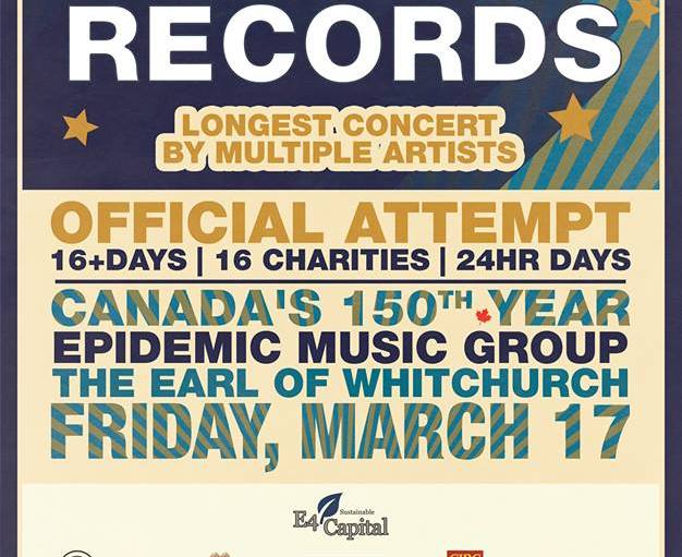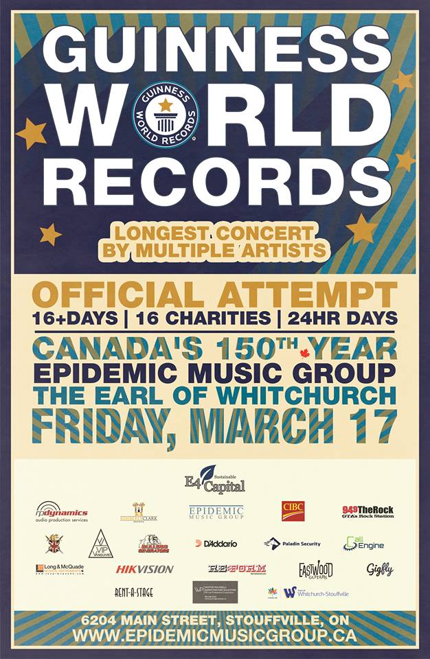 Gigfly.ca is extremely excited to announce that they will be a sponsor of the Guinness World Record attempt for the ‘Longest Concert Held by Multiple Artists’ hosted by Epidemic Music Group! This 16 day event will start on Friday, March 17th plus will involve over 380 bands and be held at the Earl of Whitchurch in Stouffville, ON.
