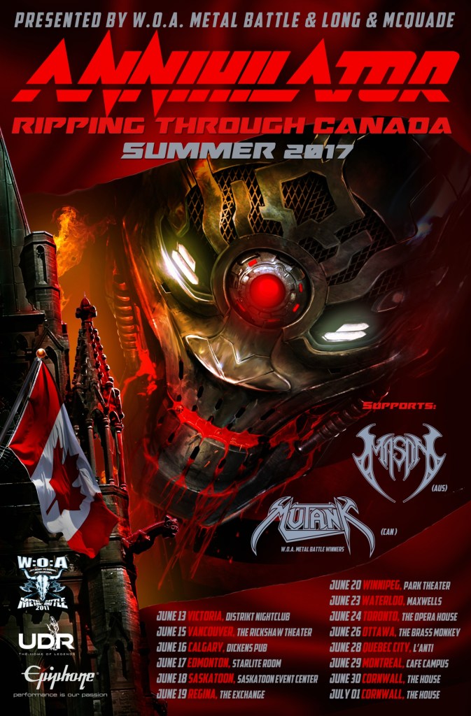 Support on this tour comes from Australia’s MASON whom was ANNIHILATOR’s support in Europe last year & from Montreal, QC thrashers MUTANK who won the acclaimed Wacken Metal Battle Canada contest in 2014 and have also performed at Wacken Open Air.