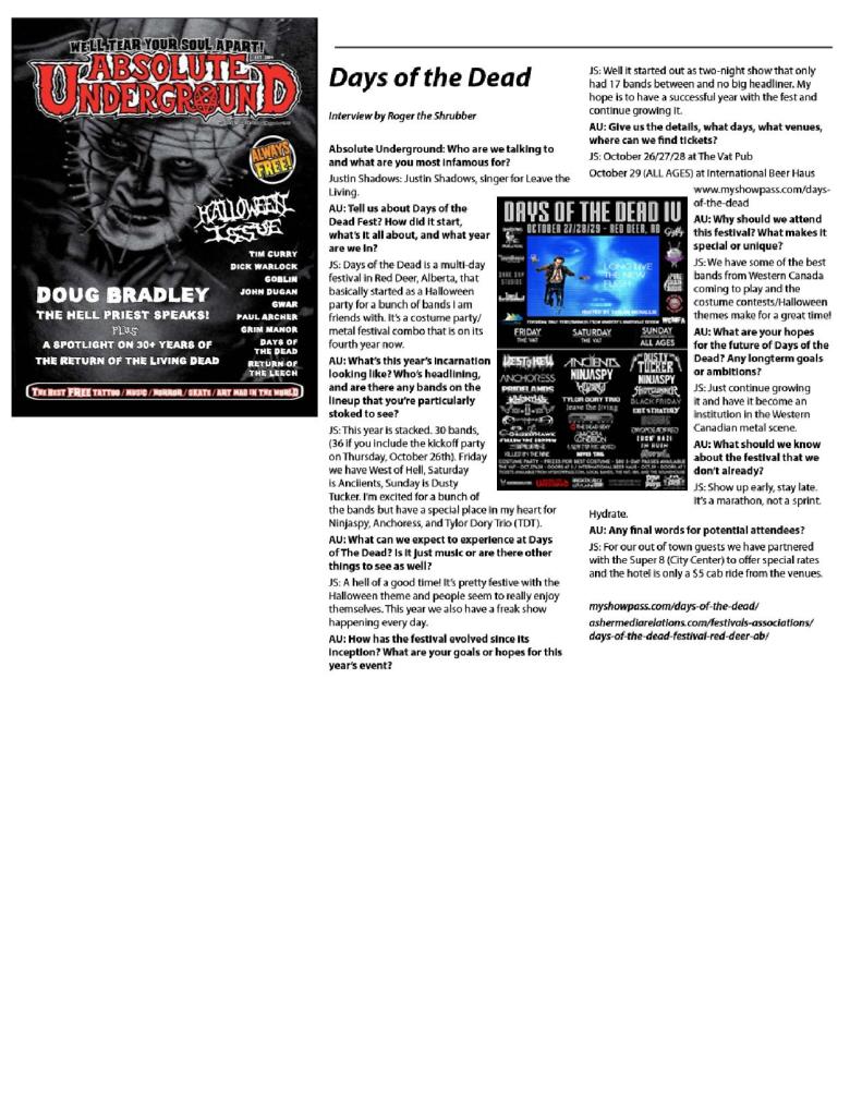 Absolute Underground Mag – Vol. 13 – #6 – Issue 78 – October- November 2017 – Days of The Dead November 15, 2017 by Asher · Days of The Dead Fest Share this:TweetShare on Tumblr Share on Reddit (Opens in new window) Reddit More Share on Blogger (Opens in new window) Blogger Like Loading... Related « Prev Leave A Comment ↓ Comments Leave a comment Cancel reply Δ Trackbacks & Pingbacks No incoming links found yet.