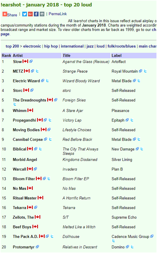 Thank you Canadian MDs and Djs! Montreal’s WARCALL #12 on January 2018 – Top 20 Loud Charts – Canadian College Radio February 9, 2018 by Asher · Warcall http://earshot-online.com/charts/2018/January/loud.cfm Share this:TweetShare on Tumblr Click to share on Reddit (Opens in new window) Reddit More Click to share on Blogger (Opens in new window) Blogger Like Loading... Related « Prev Next » Leave A Comment ↓ Comments Leave a comment Cancel reply Δ Trackbacks & Pingbacks No incoming links found yet.