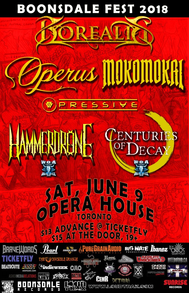 This year’s 2018 Boonsdale Fest will be held on June 9th at the Opera House in Toronto, ON and will feature bands Borealis, Operus, Mokomokai, Pressive, Hammerdrone (WMBC Western finalist) and Centuries of Decay (WMBC Eastern finalist).