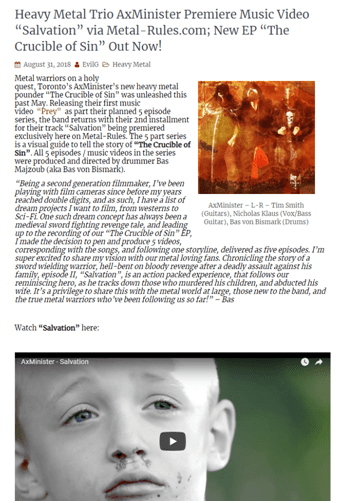 Watch “Salvation” at http://www.metal-rules.com/2018/08/31/heavy-metal-trio-axminister-premiere-music-video-salvation-via-metal-rules-com-new-ep-the-crucible-of-sin-out-now/