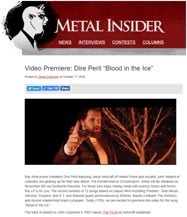 American sci-fi power metal duo DIRE PERIL featuring Jason Ashcraft (Helion Prime) and vocalist John Yelland (Judicator) are premiering their latest music video “Blood In The Ice”. The song is their third single off their upcoming album “The Extraterrestrial Compendium” due out November 9th, 2018 via Divebomb Records to follow their three previous EP releases “Astronomical Minds” (2013), “Queen of The Galaxy” (2014) and “Through Time and Space” (2015).