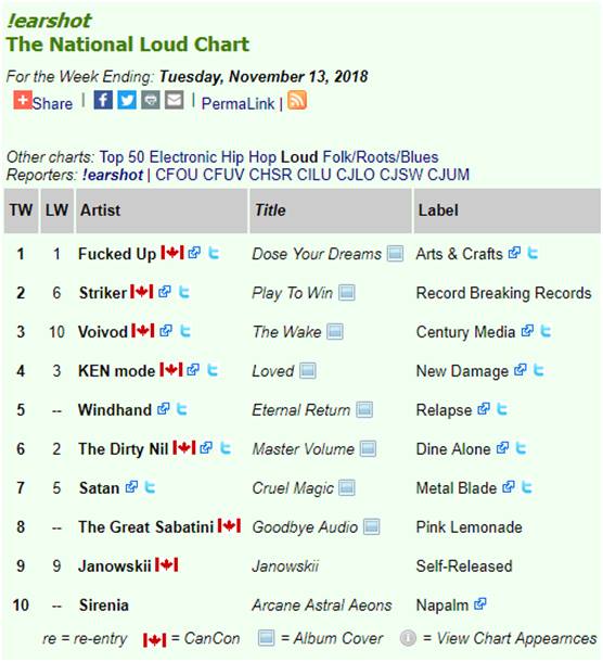 Thank you Canada! Much love to MDs and Djs for supporting Canadian Metal \m/\m/ #2 Striker (CAN), #8 The Great Sabatini The National Loud Chart For the Week Ending: Tuesday, November 13, 2018 November 14, 2018 by Asher · Striker · The Great Sabatini Thank you Canada! Much love to MDs and Djs for supporting Canadian Metal \m/\m/ #2 Striker (CAN), #8 The Great Sabatini The National Loud Chart For the Week Ending: Tuesday, November 13, 2018 http://earshot-online.com/charts/index.cfm?intChartTypeID=106&dWeekOfID=2018-11-13 Share this:TweetShare on Tumblr Click to share on Reddit (Opens in new window) Reddit More Click to share on Blogger (Opens in new window) Blogger Like Loading... Related « Prev Next » Leave A Comment ↓ Comments Leave a comment Cancel reply Δ Trackbacks & Pingbacks No incoming links found yet.