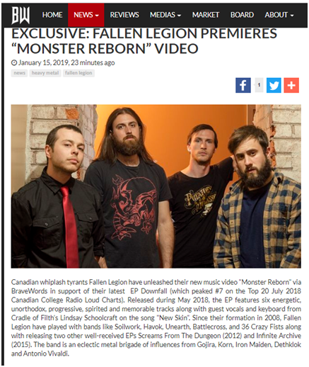 Canadian whiplash tyrants FALLEN LEGION are premiering their new music video “Monster Reborn” via Bravewords.com in support of their latest EP“Downfall” (which peaked #7 on the Top 20 July 2018 Canadian College Radio Loud Charts). Released during May 2018, the EP features six energetic, unorthodox, progressive, spirited and memorable tracks along with guest vocals and keyboard from Cradle of Filth‘s Lindsay Schoolcraft on the song “New Skin”. Since their formation in 2008, FALLEN LEGION have played with bands like Soilwork, Havok, Unearth, Battlecross, and 36 Crazy Fists along with releasing two other well-received EPs “Screams From The Dungeon” (2012) and “Infinite Archive” (2015). The band is an eclectic metal brigade of influences from Gojira, Korn, Iron Maiden, Dethklok, and Antonio Vivaldi.