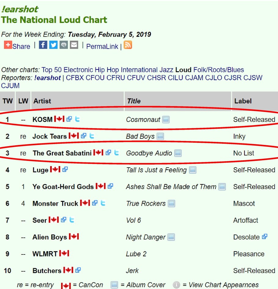 Huge Hails Horns! \m/\m/ Thank you MDs and DJs for all your airplay support of Canadian metal! Hells yeah! #1 Kosm, #3 The Great Sabatini (No List Records) !earshot – The National Loud Chart For the Week Ending: Tuesday, February 5, 2019 February 6, 2019 by Asher · KOSM · The Great Sabatini Huge Hails Horns! \m/\m/ Thank you MDs and DJs for all your airplay support of Canadian metal! Hells yeah! #1 Kosm, #3 The Great Sabatini (No List Records) !earshot – The National Loud Chart For the Week Ending: Tuesday, February 5, 2019 http://earshot-online.com/charts/index.cfm?intChartTypeID=106 Share this:TweetShare on Tumblr Click to share on Reddit (Opens in new window) Reddit More Click to share on Blogger (Opens in new window) Blogger Like Loading... Related « Prev Next » Leave A Comment ↓ Comments Leave a comment Cancel reply Δ Trackbacks & Pingbacks No incoming links found yet.