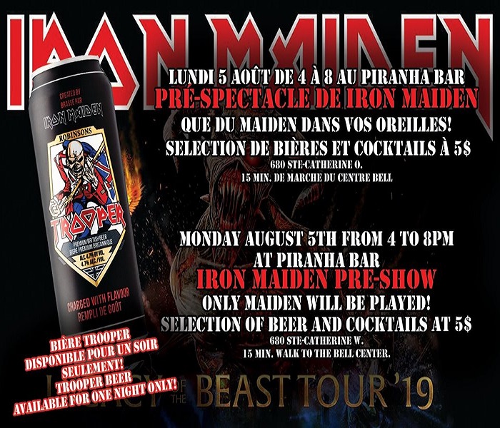 Venez écouter du Maiden et prendre un verre avant le spectacle de Iron Maiden au @centrebell.mtl lundi 5 août de 4 à 8pm! La bière Trooper sera disponible pour l’occasion!