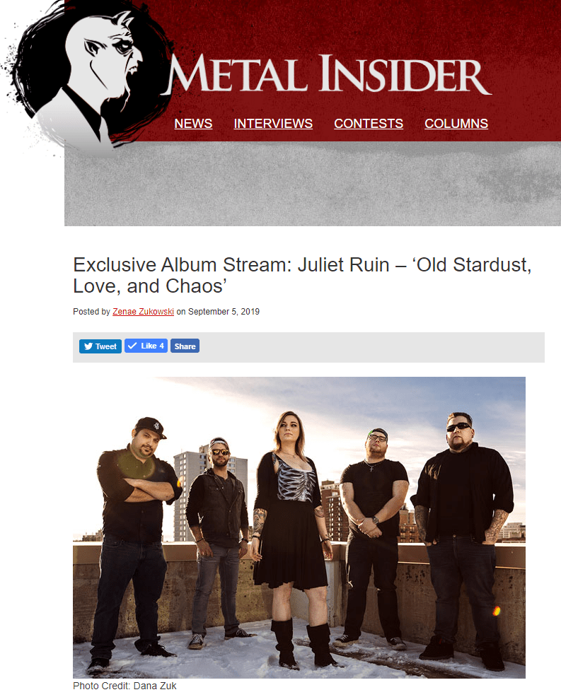 Edmonton, AB’s JULIET RUIN will be unleashing their first full-length album “Old Stardust, Love and Chaos” on September 6, 2019 to follow their 2017 debut self titled EP. The release promises to be more technical with heavy instrumentation, including some dabbling in low tuned 7 string guitars to create an original sound chock full of catchy hooks that convey a fresh and emotive feel to their heavy music. Lead vocalist Jess Ruin has added more screams, but also more clean techniques with her pop-esque power vocals. Fans of forward-thinking modern metal such as Evanescence, System of a Down, and Killswitch Engage should take special note of this powerful and emotive Canadian band.