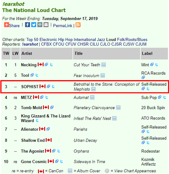 Sophist Debut #3 on the Top 10 National Loud Chart For the Week Ending: Tuesday, September 17, 2019 September 18, 2019 by Asher · Sophist https://earshot-online.com/charts/index.cfm?intChartTypeID=106&dWeekOfID=2019-09-17 Share this:TweetShare on Tumblr Click to share on Reddit (Opens in new window) Reddit More Click to share on Blogger (Opens in new window) Blogger Like Loading... Related « Prev Next » Leave A Comment ↓ Comments Leave a comment Cancel reply Δ Trackbacks & Pingbacks No incoming links found yet.