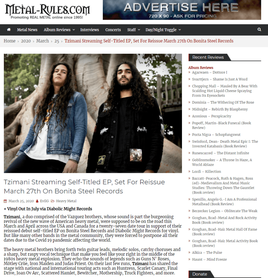 Tzimani, a duo comprised of the Vazquez brothers, whose sound is part the burgeoning revival of the new wave of American heavy metal, were supposed to be on the road this March and April across the USA and Canada for a twenty-seven date tour in support of their reissued debut self-titled EP on Bonita Steel Records and Diabolic Might Records for vinyl. But like many other bands in the metal community, they were forced to postpone all their dates due to the Covid 19 pandemic affecting the world.