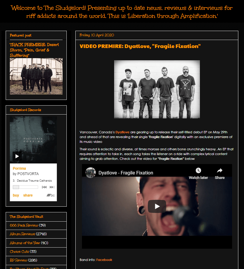 Vancouver, Canada’s Dyatlove are gearing up to release their self-titled debut EP this year and ahead of that are revealing their single ‘Fragile Fixation’ digitally with an exclusive premiere of its music video via The Sludgelord HERE.