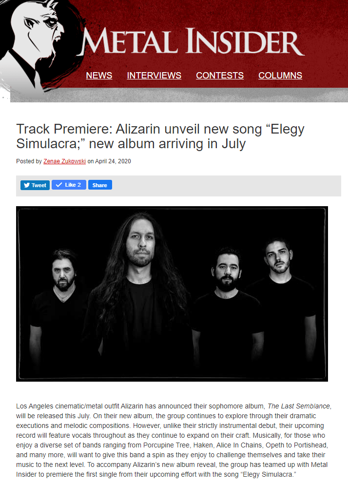 Cinematic rock metallers Alizarin announce they will be releasing their sophomore album “The Last Semblance” this coming July and are excited to share the full length’s artwork plus track listing along with the premiere of lead single ‘Elegy Simulacra’. The nearly 8-minute epic prog track is described by the band as “one of the fastest tunes on the album. It’s energetic, urgent, and driven by a persistent hypnotic riff. By the time the tune is complete the listener will feel they’ve been on one mind-bending journey, fully setting up the rest of the record.“