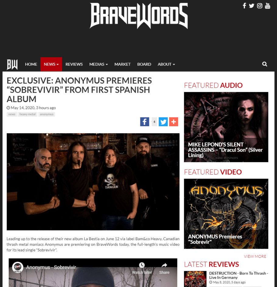 Leading up to the release of their new album “La Bestia” on June 12th via label Bam&co Heavy, Canadian thrash metal maniacs Anonymus is sharing the full length’s lead first single “Sobrevivir”.