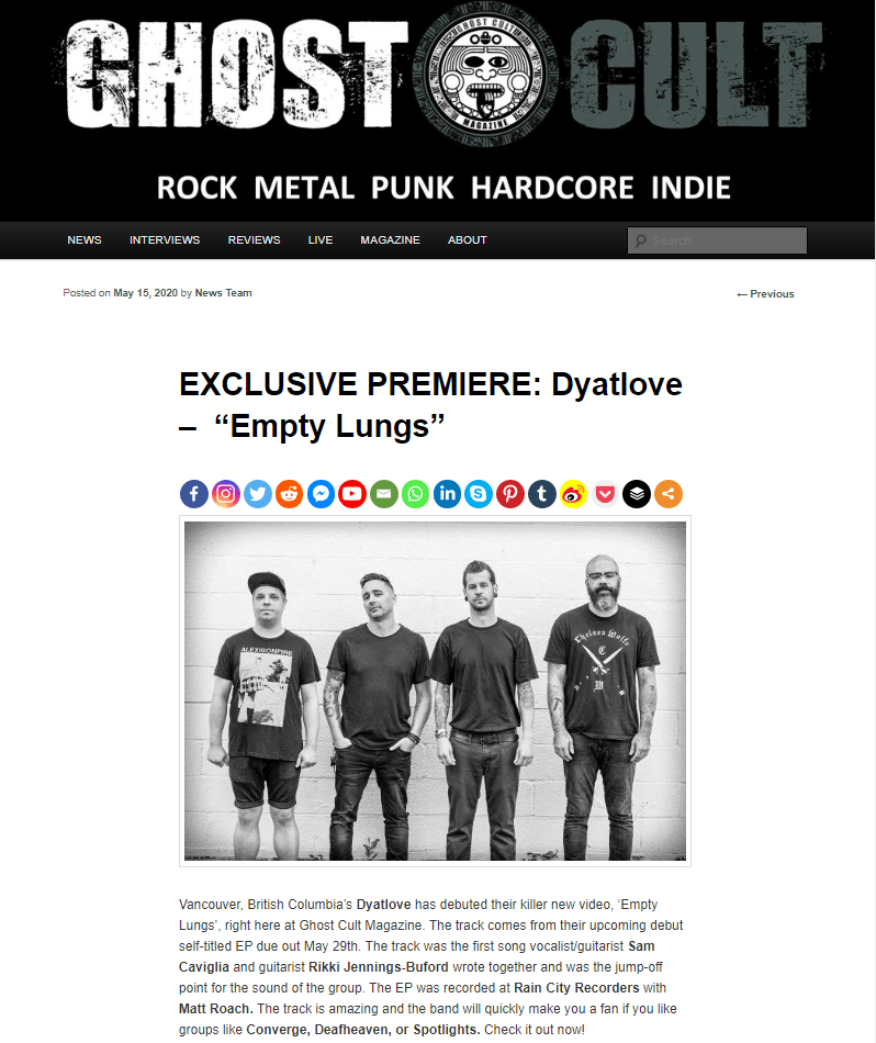 Vancouver’s DYATLOVE Premiere Single ‘Empty Lungs’ via GhostCultMag