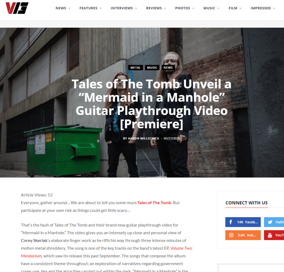 Edmonton death metal duo Tales of The Tomb are sharing with fans their latest guitar playthrough for ‘Mermaid In A Manhole’. The song is a bonus track that comes off of the band’s latest EP “Volume Two: Mendicium” unleashed this past September. The EP itself is a collection of narratives surrounding government cover-ups, national lies, and the heinous crimes committed amongst the shadows. It’s also a vicious bite of grinding blast beats, technical shredding accompanied by venomous guttural lows.
