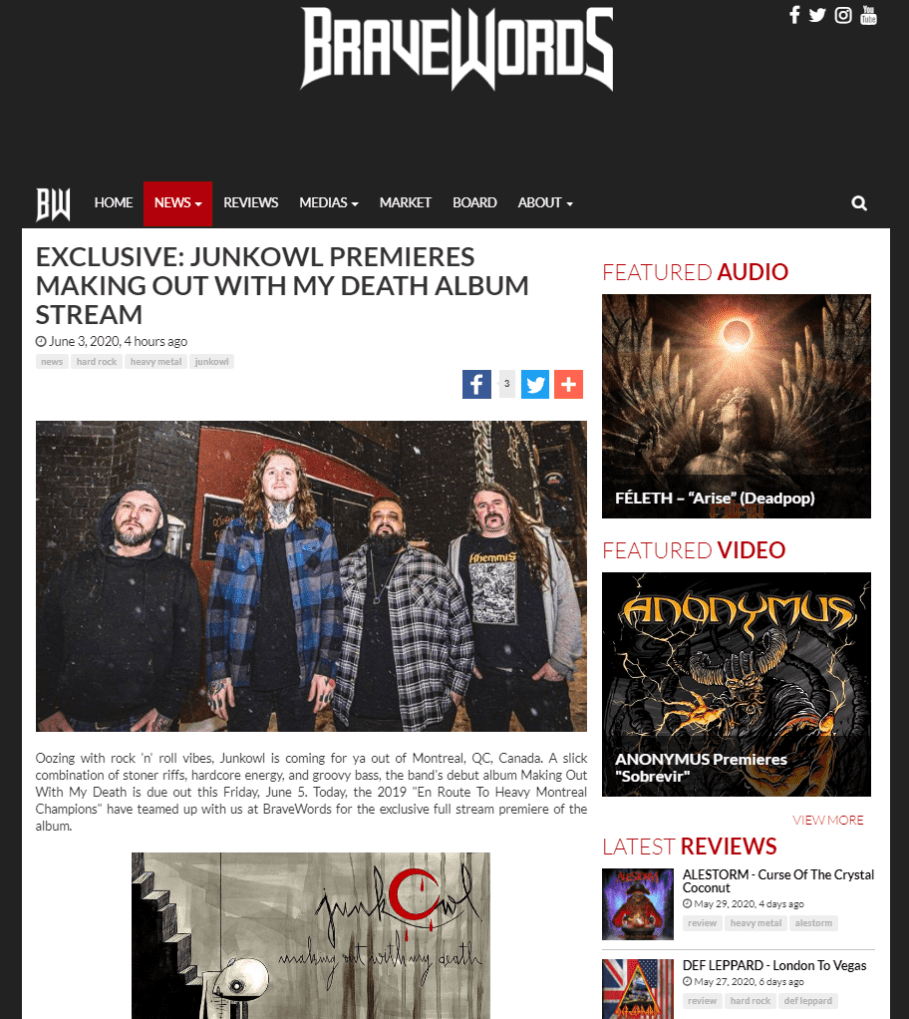 Montreal’s Junkowl Premiere Album Stream “Making Out With My Death” via Bravewords
