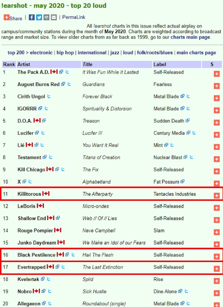 Huge Hails Horns! \m/\m/ Thank You Canadian MDs and DJs! Much Love! !earshot – may 2020 – top 20 loud https://earshot-online.com/charts/2020/May/loud.cfm #11 Killitorous – The Afterparty – •• Tentacles Industries •• #16 Black Pestilence – Hail The Flesh – Self-Released #17 [EVERTRAPPED] – The Last Extinction – Self-Released