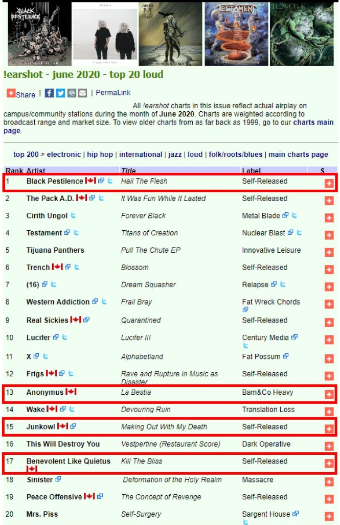 Thank you DJs and MDs! \m/\m/ !earshot – June 2020 – Top 20 Loud – Canadian College Radio #1 Black Pestilence #13 Anonymus #15 JUNKOWL #17 Benevolent Like Quietus July 9, 2020 by Asher · Anonymus · Benevolent Like Quietus · black pestilence · Junkowl Thank you DJs and MDs! \m/\m/ !earshot – June 2020 – Top 20 Loud – Canadian College Radio #1 Black Pestilence #13 Anonymus #15 JUNKOWL #17 Benevolent Like Quietus https://earshot-online.com/charts/2020/June/loud.cfm Share this:TweetShare on Tumblr Click to share on Reddit (Opens in new window) Reddit More Click to share on Blogger (Opens in new window) Blogger Like Loading... Related Thank you DJs and MDs! \m/\m/ !earshot - June 2020 - Top 20 Loud - Canadian College Radio #1 Black Pestilence #13 Anonymus #15 JUNKOWL #17 BLQ - Benevolent Like Quietus https://earshot-online.com/char « Prev Next » Leave A Comment ↓ Comments Leave a comment Cancel reply Δ Trackbacks & Pingbacks No incoming links found yet.