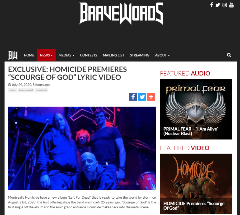 Montreal’s Homicide have a new album “Left For Dead” that is ready to take the world by storm on August 21st, 2020; the first offering since the band went dark 25 years ago. “Scourge of God” is the first single off the album and the sonic grand entrance Homicide makes back into the metal scene.