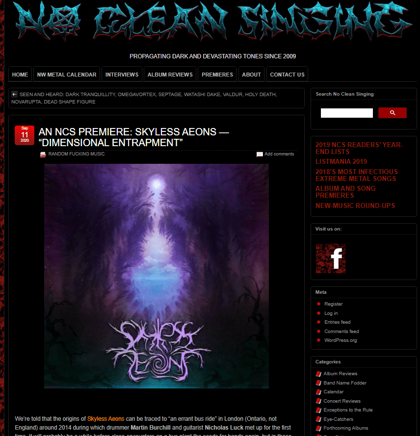 “There’s a rich diversity to Skyless Aeons’ music, even though their material is cohesive and doesn’t feel the need to go into extra clean, girlfriend metal territories to get the point across. The four tracks (all between seven to eleven minutes) are progressive affairs without too much fluff. The guitars of Nicholas Luck alternate between early 90s tremolos, a modern dissonant approach to black metal and a healthy dose of melancholic Nordic melodic death metal and he plays everything well.” – Metantoine’s Magickal Realm