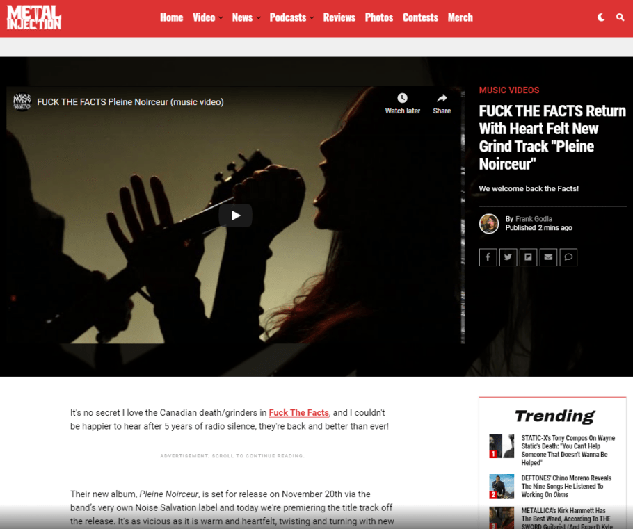It’s been half a decade since Fuck The Facts’ last release, Juno nominated “Desire Will Rot”, but the band continues right where they left off, offering up another slab of their patented “bastardized” grindcore full of all the twists and turns that fans have come to expect. Their new album, “Pleine Noirceur”, set for release on November 20th via the band’s very own Noise Salvation label, and is introduced with a video single for the release’s title track, which can be viewed and heard via its premiere on MetalInjection HERE.