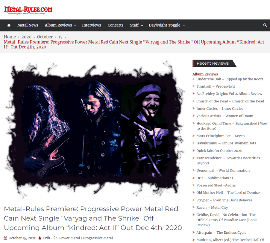 Canada’s Red Cain is finishing their “Kindred” saga with the release of “Kindred: Act II” on December 4th, 2020 to follow their 2019 album “Kindred: Act I” unleashed via Sliptrick Records. Over the past few months of this year, they have shared three singles off the forthcoming full length “Sunshine (Blood Sun Empire)”, “Demons” and “Kindred”. Today, they present their final single “Varyag and The Shrike” off the upcoming record. Recommended for fans of Kamelot, Mastodon, and Amaranthe the track can be heard via its premiere on Metal-Rules HERE.