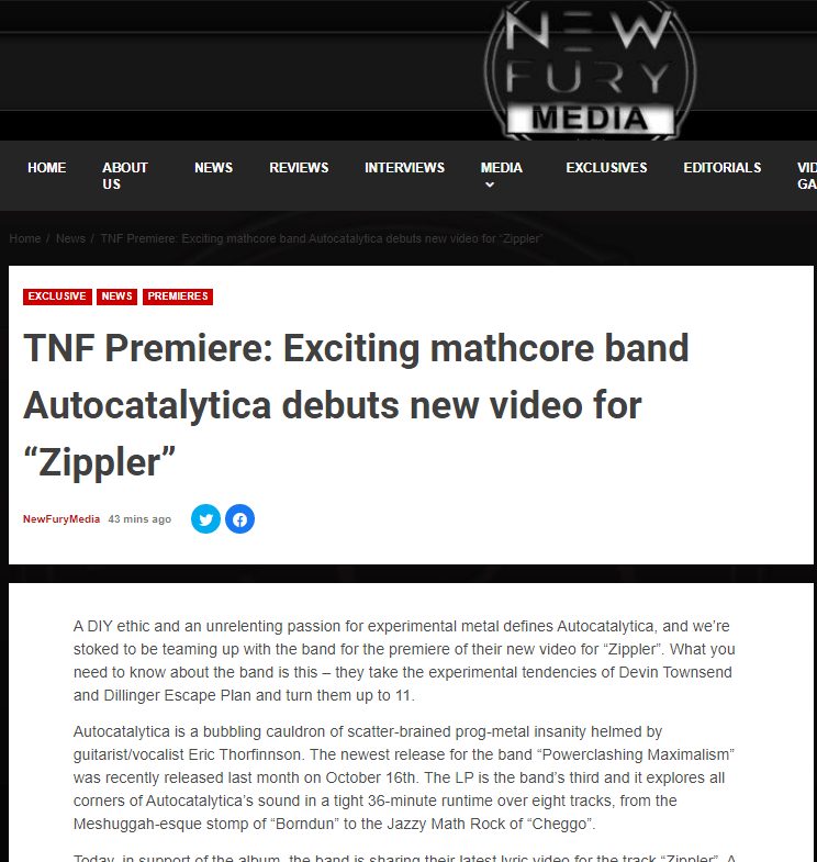 “This is an album that’s just on all the time; at its core, it is a progressive metal work, with Protest the Hero as a possible cited influence. But in other places, the album also uses a copious amount of strings, wind instruments, and jazz-inflected time signatures to create a whirlwind of groove, aggression, and, here we go, maximalism. “Cheggo”, which we are proud to premiere here today, has all of that and more. From its nu-prog opening, through the more dreamy middle passages and all the way to its noisy outro, “Cheggo” is everything that’s great about Autocatalytica and Powerclashing Maximalism.” – Heavy Blog Is Heavy