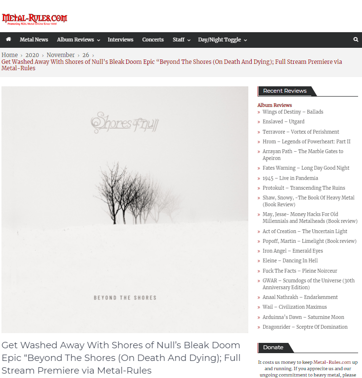 After an extended amount of time introducing the musicians and teasing with excerpts the entirety of Shores of Null’s “Beyond The Shores (On Death And Dying)” is ready for the world. The massive 38-minute single-track album takes the listener through the stages of grief propelled by thunderous doom music tied off with ethereal vocals.