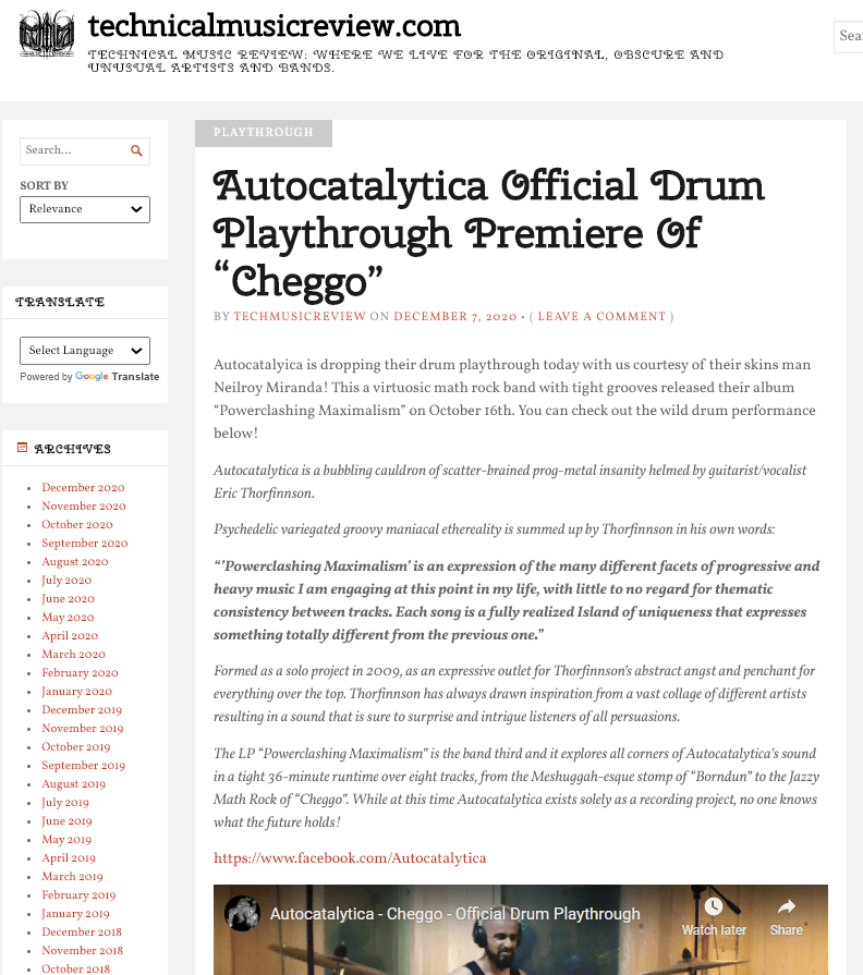 “This is an album that’s just on all the time; at its core, it is a progressive metal work, with Protest the Hero as a possible cited influence. But in other places, the album also uses a copious amount of strings, wind instruments, and jazz-inflected time signatures to create a whirlwind of groove, aggression, and, here we go, maximalism. “Cheggo”, which we are proud to premiere here today, has all of that and more. From its nu-prog opening, through the more dreamy middle passages and all the way to its noisy outro, “Cheggo” is everything that’s great about Autocatalytica and Powerclashing Maximalism.” – Heavy Blog Is Heavy