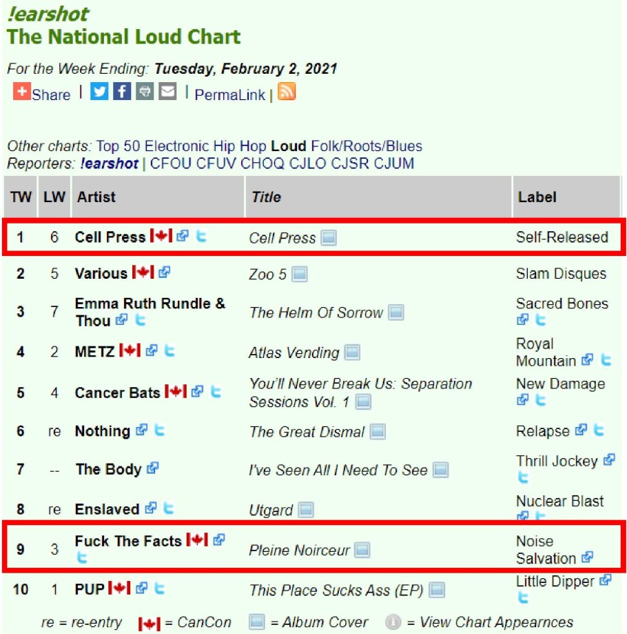 Thank You so much for your support Canadian MDs and DJs! \m/\m/ #1 Cell Press, #9 Fuck The Facts !earshot The National Loud Chart For the Week Ending: Tuesday, February 2, 2021 February 3, 2021 by Asher · Cell Press · Fuck The Facts Thank You so much for your support Canadian MDs and DJs! \m/\m/ #1 Cell Press, #9 Fuck The Facts !earshot The National Loud Chart For the Week Ending: Tuesday, February 2, 2021 https://www.earshot-online.com/charts/index.cfm?intChartTypeID=106&dWeekOfID=2021-02-02 Share this:TweetShare on Tumblr Click to share on Reddit (Opens in new window) Reddit More Click to share on Blogger (Opens in new window) Blogger Like Loading... Related « Prev Next » Leave A Comment ↓ Comments Leave a comment Cancel reply Δ Trackbacks & Pingbacks No incoming links found yet.