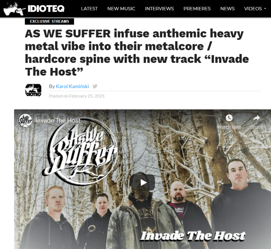 Ottawa’s As We Suffer are releasing their debut album “The Fallen Pillars” in April of 2021. So far, the band has shared with fans the first single and title track just this past January. Today they present their next single “Invade The Host” via its premiere on IDIOTEQ HERE.
