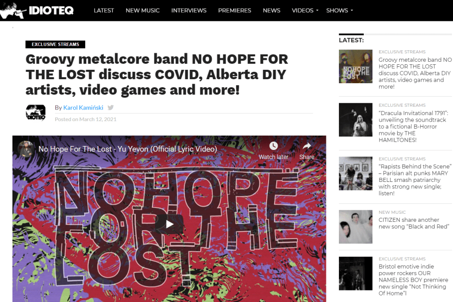“It is the combination of an old demo from a band both Re and Nate had their separate times in, with the new direction that they had both been imagining. It ended up becoming a heavy yet upbeat back and forth between pummeling rhythms and soaring choruses. A very verse/chorus/verse/bridge/chorus song at heart, “Yu Yevon” was designed to be the set opener/EP kickstarter that reintroduces us as No Hope For The Lost.”