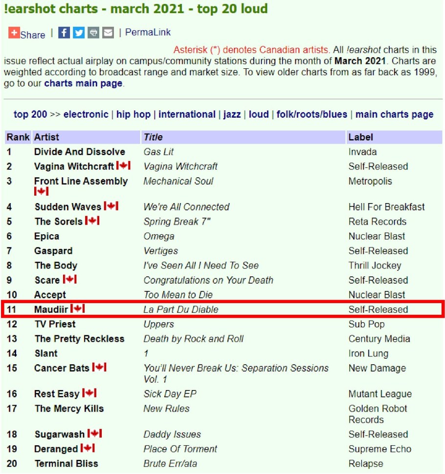 Hails Horns \m/\m/ MDs and DJs Thanks for the airplay love! #11 Maudiir on March 2021 Top 20 Loud April 9, 2021 by Asher · Maudiir Hails Horns \m/\m/ MDs and DJs Thanks for the airplay love! #11 Maudiir on March 2021 Top 20 Loud https://earshot-online.com/charts/2021/March/loud.cfm Share this:TweetShare on Tumblr Click to share on Reddit (Opens in new window) Reddit More Click to share on Blogger (Opens in new window) Blogger Like Loading... Related « Prev Next » Leave A Comment ↓ Comments Leave a comment Cancel reply Δ Trackbacks & Pingbacks No incoming links found yet.