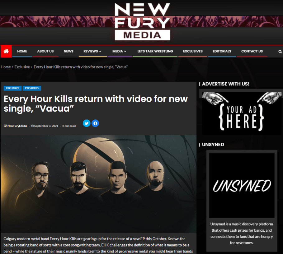 Calgary’s Every Hour Kills is a musical experiment that challenges what defines a band. Rather, the group sees itself as a constantly evolving musical collective; guest vocalists and soloists across the songs bring their own unique artistry and elevate the collective impact of Every Hour Kills’ brand. The latest from them is the upcoming EP “Vacua” and the next single is the title track.