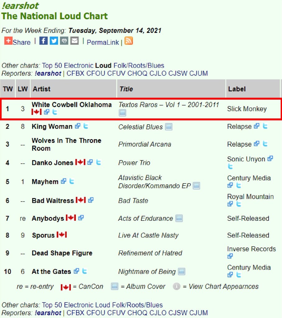 #1 White Cowbell Oklahoma Huge Hails Horns! \m/\m/ Much love Canadian MDs and DJs for your airplay support! !earshot – The National Loud Chart For the Week Ending: Tuesday, September 14, 2021 September 15, 2021 by Asher · Music News · White Cowbell Oklahoma #1 White Cowbell Oklahoma Huge Hails Horns! \m/\m/ Much love Canadian MDs and DJs for your airplay support! !earshot – The National Loud Chart For the Week Ending: Tuesday, September 14, 2021 https://www.earshot-online.com/charts/index.cfm?intChartTypeID=106&dWeekOfID=2021-09-14 Share this:TweetShare on Tumblr Click to share on Reddit (Opens in new window) Reddit More Click to share on Blogger (Opens in new window) Blogger Like Loading... Related « Prev Next » Leave A Comment ↓ Comments Leave a comment Cancel reply Δ Trackbacks & Pingbacks No incoming links found yet.
