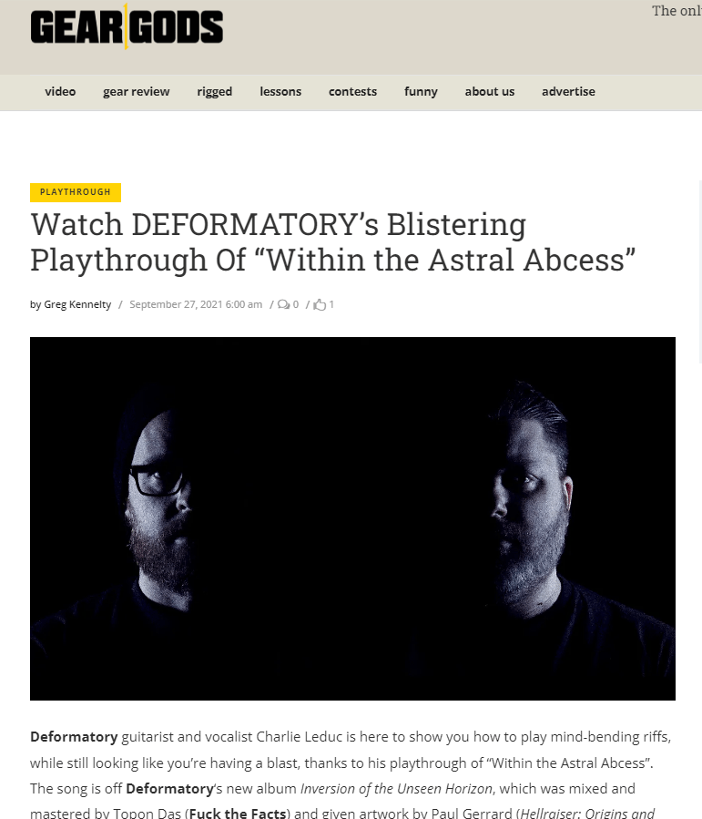 Canadian death metal duo Deformatory, helmed by Charlie Leduc (Guitars & Vocals) and Neil Grandy (Drums) recently unleashed their third full-length, “Inversion of the Unseen Horizon”. This newest death metal offering contains 9 relentlessly brutal tracks wrapped in a beautifully complex concept, designed to overwhelm & entice the senses.