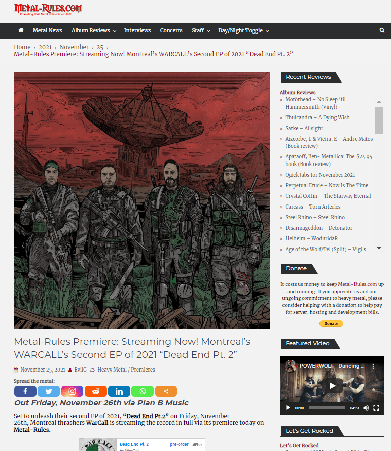 Set to unleash their second EP of 2021, “Dead End Pt.2” on Friday, November 26th, Montreal thrashers WarCall is streaming the record in full via its premiere on Metal-Rules HERE.