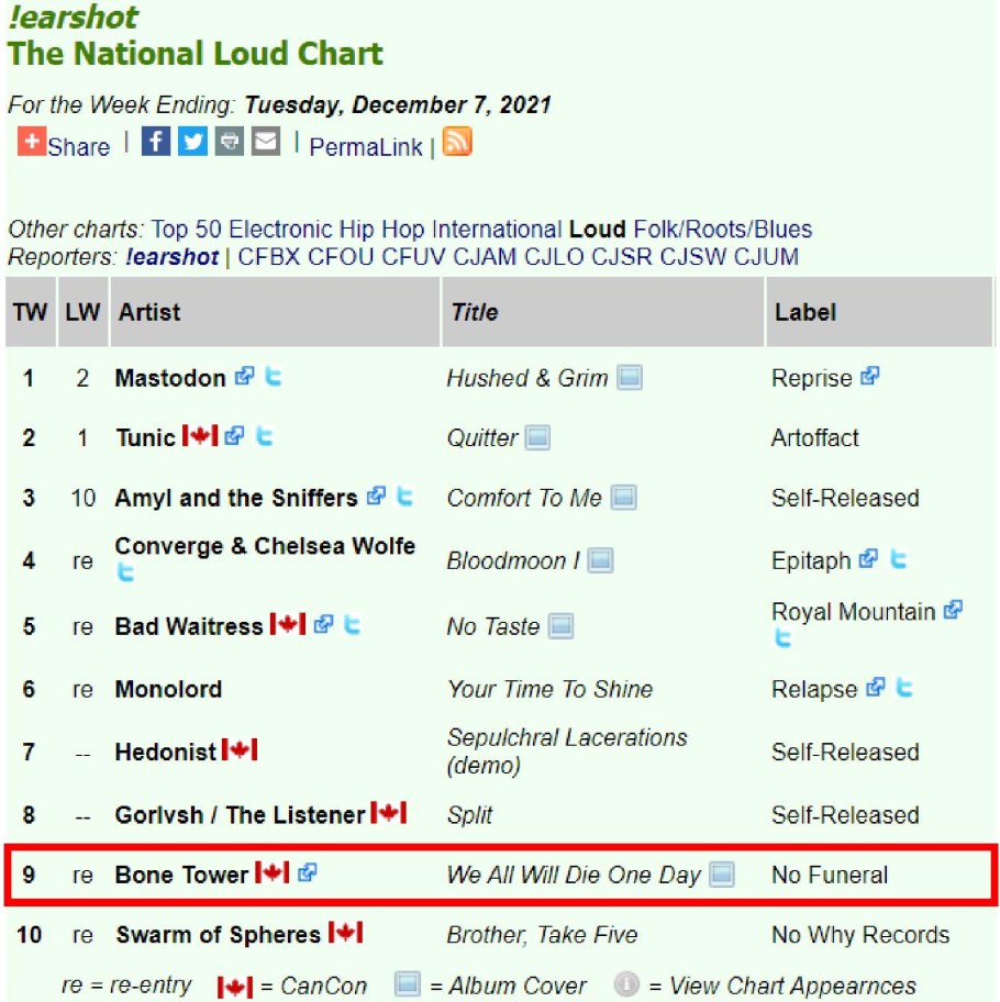 \m/\m/ Thank You MDs and DJs \m/\m/ #9 bone tower – No Funeral Records earshot – The National Loud Chart For the Week Ending: Tuesday, December 7, 2021 December 8, 2021 by Asher · Bone Tower (No Funeral Records / Fresh Outbreak Records) · Music News \m/\m/ Thank You MDs and DJs \m/\m/ #9 bone tower – No Funeral Records earshot – The National Loud Chart For the Week Ending: Tuesday, December 7, 2021 https://earshot-online.com/charts/index.cfm?intChartTypeID=106&dWeekOfID=2021-12-07 Share this:TweetShare on Tumblr Click to share on Reddit (Opens in new window) Reddit More Click to share on Blogger (Opens in new window) Blogger Like Loading... Related 2021 https://earshot-online.com/charts/index.cfm?intChartTypeID=106&dWeekOfID=2021-12-07 December 7 \m/\m/ Thank You MDs and DJs \m/\m/ #9 bone tower - No Funeral Records earshot - The National Loud Chart For the Week Ending: Tuesday « Prev Next » Leave A Comment ↓ Comments Leave a comment Cancel reply Δ Trackbacks & Pingbacks No incoming links found yet.