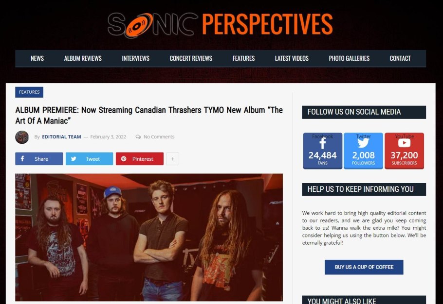 Edmonton thrash attack TYMO will be unleashing their new album “The Art Of A Maniac” on February 5th for North America and Europe along with its Japanese release on February 16th via Spiritual Beast and before it officially drops, it can be heard in full via its stream premiere on SonicPerspectives HERE.