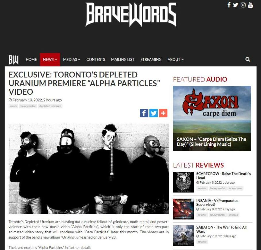 Toronto’s Depleted Uranium are blasting out a nuclear fallout of grindcore, math-metal, and power-violence with their new music video “Alpha Particles”, which is only the start of their two-part animated video story that will continue with “Beta Particles” later this month. The videos are in support of the band’s new album “Origins”, unleashed on Jan 28th of this year.