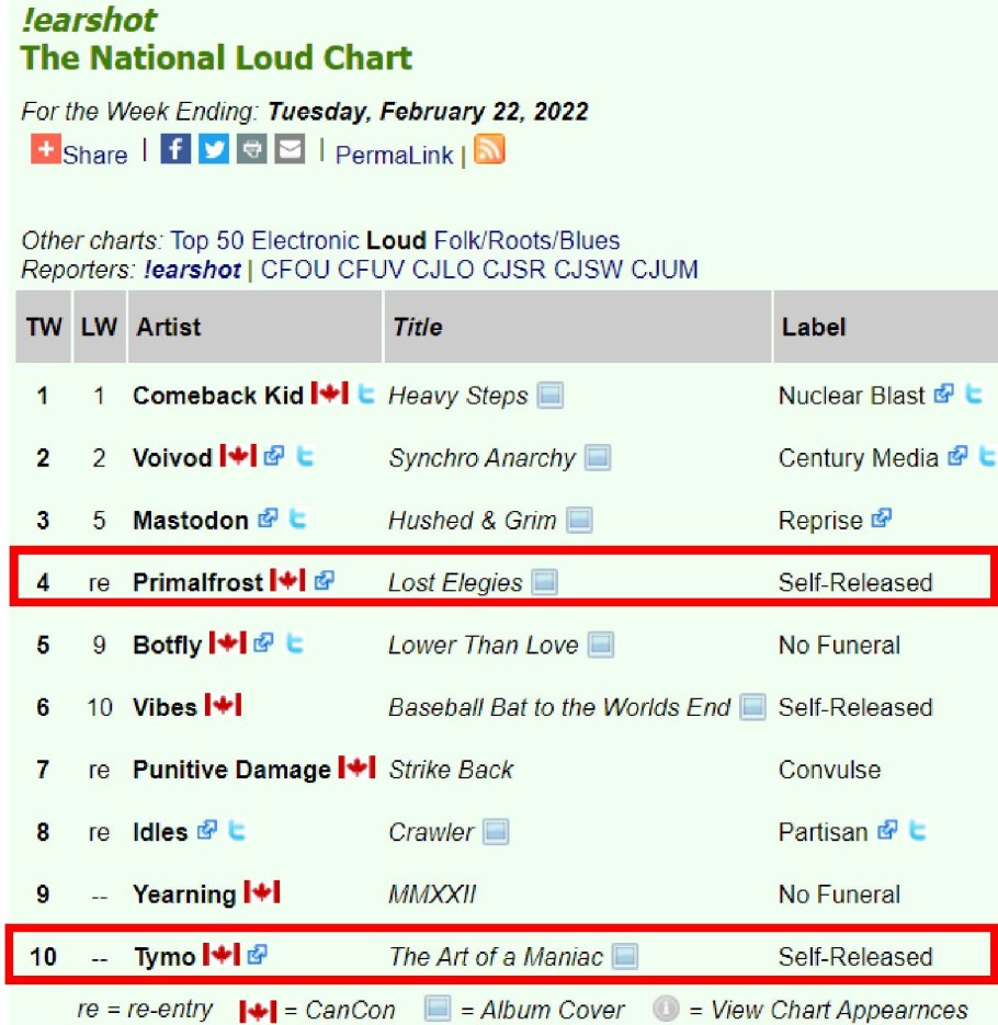 Hails Horns \m/\m/ Thank You Canadian MDs and DJs for the airplay love! \m/\m/ !earshot – The National Loud Chart – For the Week Ending: Tuesday, February 22, 2022 #4 Primalfrost – Lost Elegies #10 Tymo – The Art of A Maniac February 23, 2022 by Asher · Primalfrost · Tymo Hails Horns \m/\m/ Thank You Canadian MDs and DJs for the airplay love! \m/\m/ !earshot – The National Loud Chart – For the Week Ending: Tuesday, February 22, 2022 #4 Primalfrost – Lost Elegies #10 Tymo – The Art of A Maniac https://earshot-online.com/charts/index.cfm?intChartTypeID=106&dWeekOfID=2022-02-22 Share this:TweetShare on Tumblr Click to share on Reddit (Opens in new window) Reddit More Click to share on Blogger (Opens in new window) Blogger Like Loading... Related « Prev Next » Leave A Comment ↓ Comments Leave a comment Cancel reply Δ Trackbacks & Pingbacks No incoming links found yet.
