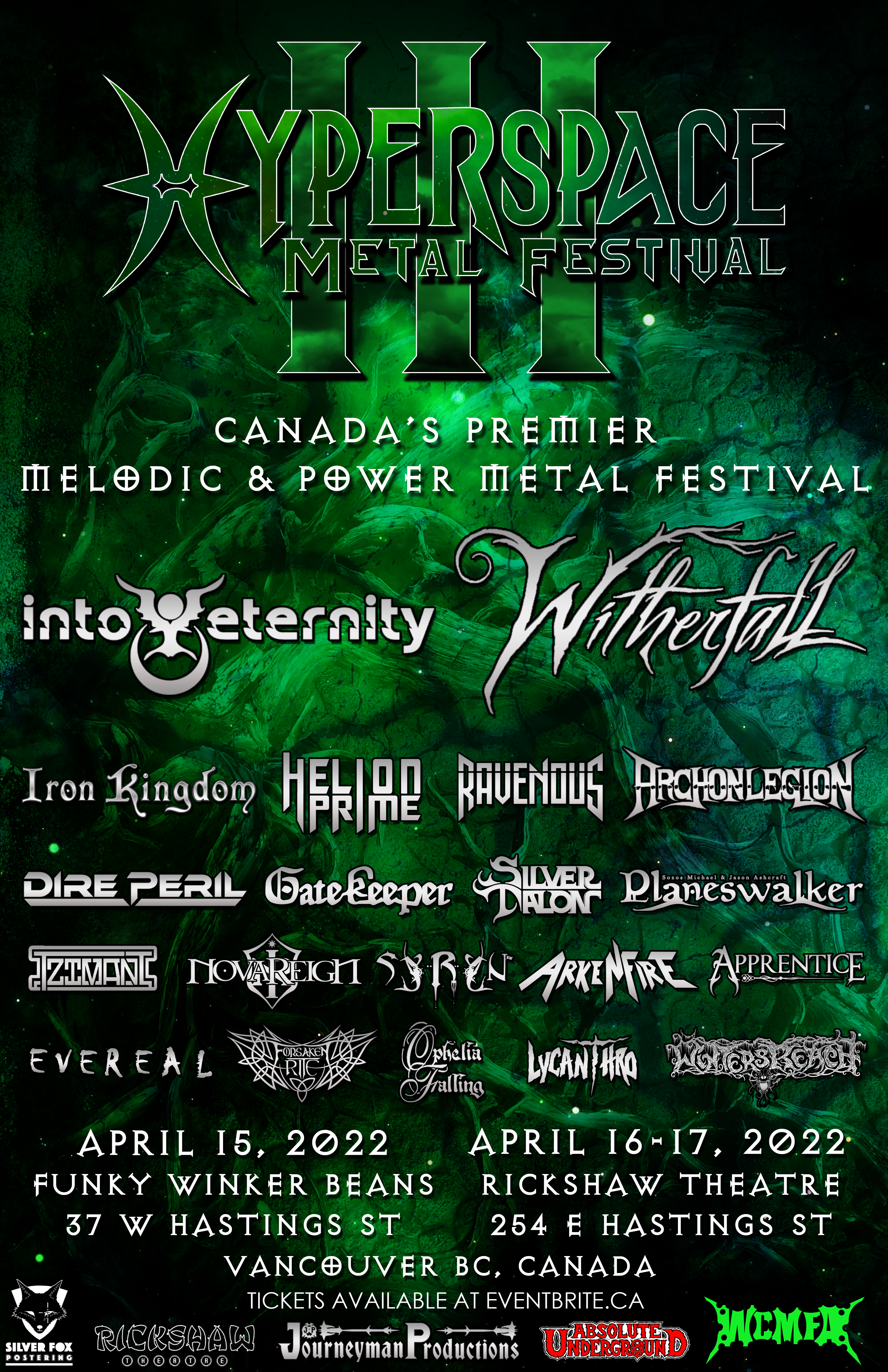 “We are very excited to bring to you the lineup for the rescheduled Hyperspace Metal Festival III! It’s been a long time and most of the bands on the lineup have held on this long waiting for the festival to happen. There have been some changes to the lineup; please welcome Into Eternity, Witherfall, Archon Legion, Dire Peril and Planeswalker to the lineup! This is going to be an unforgettable weekend of melodic metal that if you are a fan of the genre you are not going to want to miss! See you in April!” adds Hyperspace Metal Festival organizer Joey Hockin.