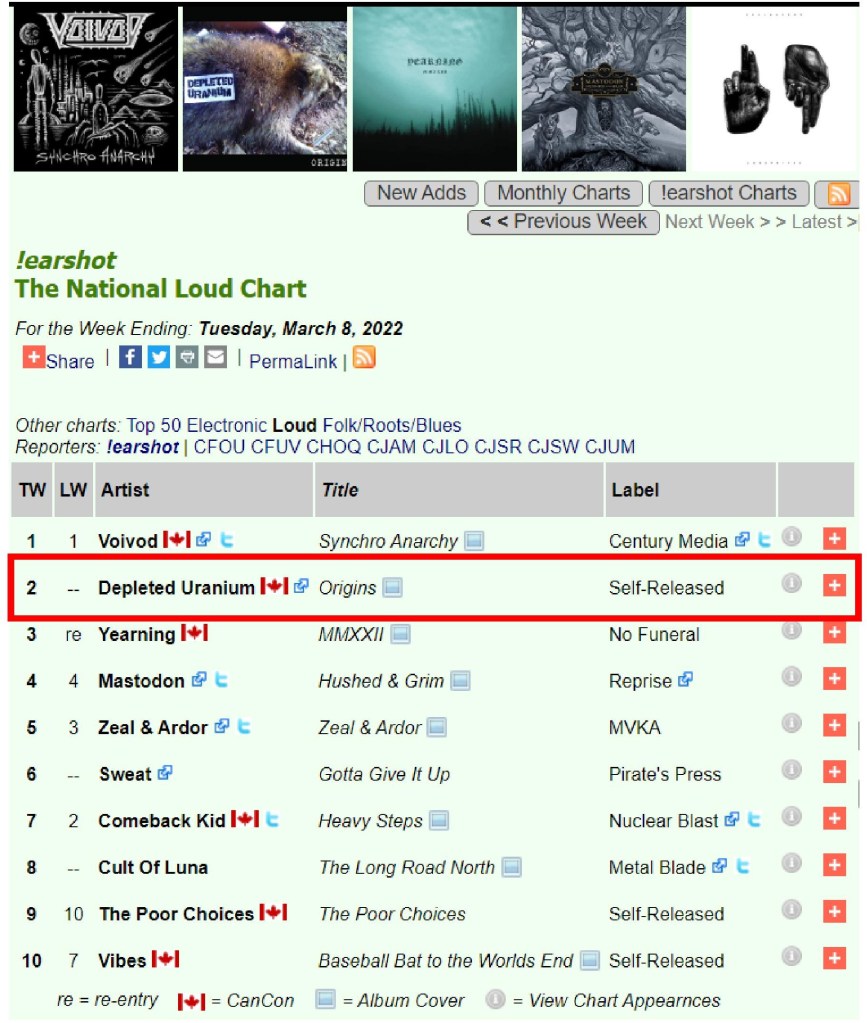 Thank You Canadian MDs and DJs for the airplay love! \m/\m/ !earshot The National Loud Chart – #2 Depleted Uranium For the Week Ending: Tuesday, March 8, 2022 March 9, 2022 by Asher · Depleted Uranium Thank You Canadian MDs and DJs for the airplay love! \m/\m/ !earshot The National Loud Chart – #2 Depleted Uranium For the Week Ending: Tuesday, March 8, 2022 – https://earshot-online.com/charts/index.cfm?intChartTypeID=106&dWeekOfID=2022-03-08 Share this:TweetShare on Tumblr Click to share on Reddit (Opens in new window) Reddit More Click to share on Blogger (Opens in new window) Blogger Like Loading... Related « Prev Next » Leave A Comment ↓ Comments Leave a comment Cancel reply Δ Trackbacks & Pingbacks No incoming links found yet.