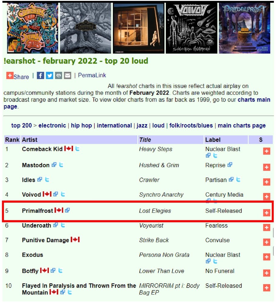 Thank You Canadian MDs and DJs for the airplay love! \m/\m/ !earshot -Top February 2022 – top 20 loud #5 Primalfrost – Lost Elegies https://earshot-online.com/charts/2022/February/loud.cfm