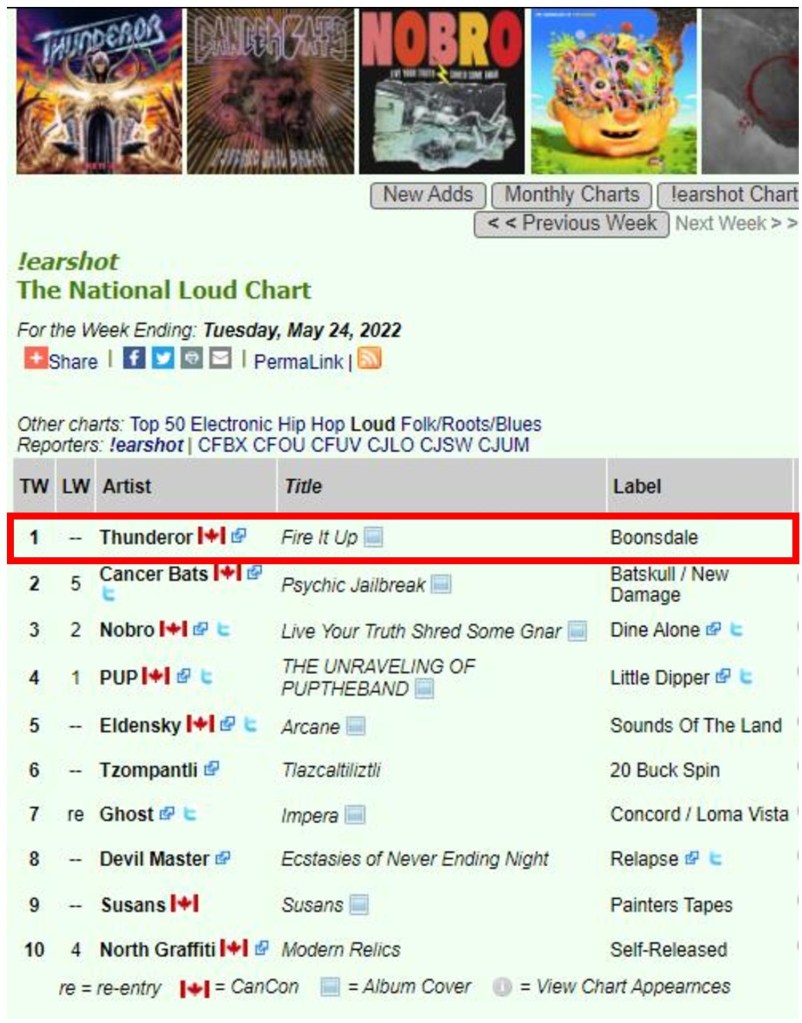 Hails Horns! \m/\m/ Thank you for the airplay love Canadian MDs and DJs #1 Thunderor !earshot – The National Loud Chart For the Week Ending: Tuesday, May 24, 2022 May 25, 2022 by Asher · Thunderor https://earshot-online.com/charts/index.cfm?intChartTypeID=106&dWeekOfID=2022-05-24 Share this:TweetShare on Tumblr Click to share on Reddit (Opens in new window) Reddit More Click to share on Blogger (Opens in new window) Blogger Like Loading... Related « Prev Next » Leave A Comment ↓ Comments Leave a comment Cancel reply Δ Trackbacks & Pingbacks No incoming links found yet.